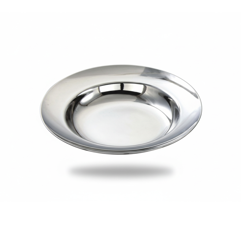 Its stainless steel construction ensures hygiene, durability, and easy cleaning, making it ideal for both home and commercial use. The plate is versatile enough to serve soups, broths, curries, or desserts, providing a practical and stylish solution for Indian kitchens.
